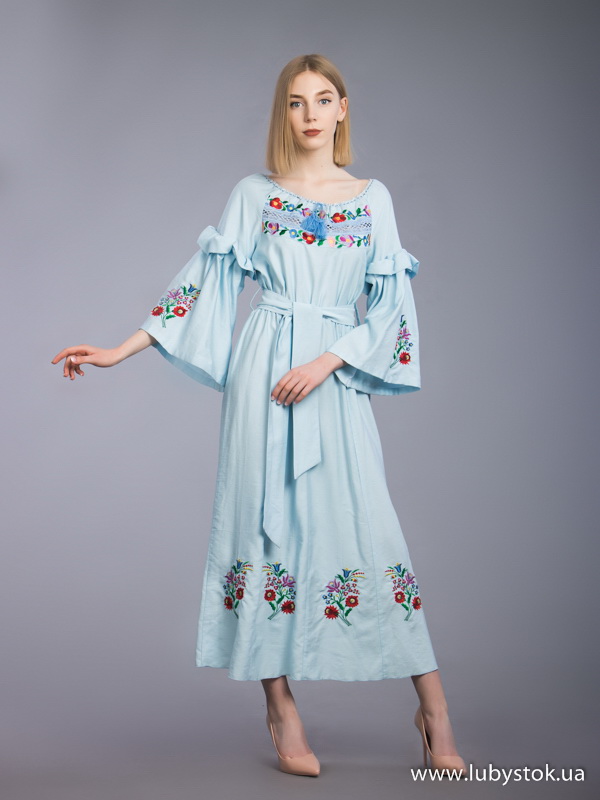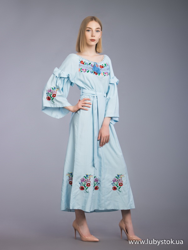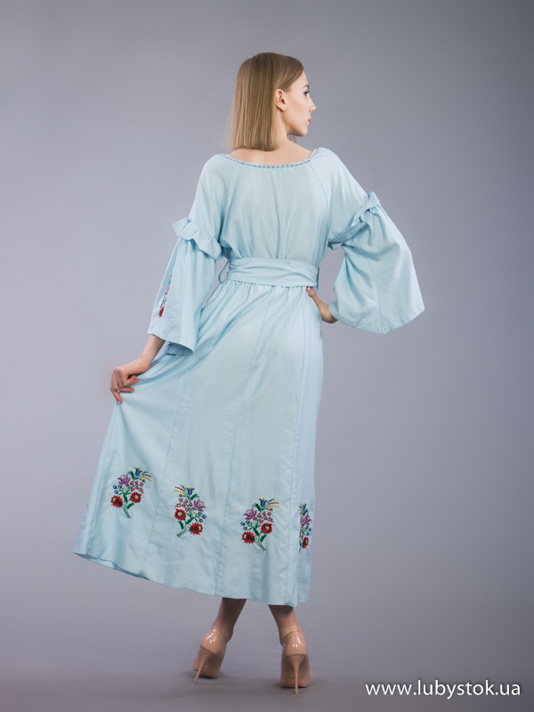 Вишита сукня гладдю ЖПВ 70-1. Завдяки візерунку сукня має оригінальний вигляд. Стиль cукні сучасний з традиційними мотивами на блакитному льоні. Плаття-вишиванка вишите гладдю зеленими, червоними, жовтими, синіми та фіолетовими нитками з віскози. Візерунок вишивки рослинний у вигляді ківітів. Рукав довгий. Цю сукню можна одягнути як у святкові так і у дні коли хочеться мати особливий вигляд.