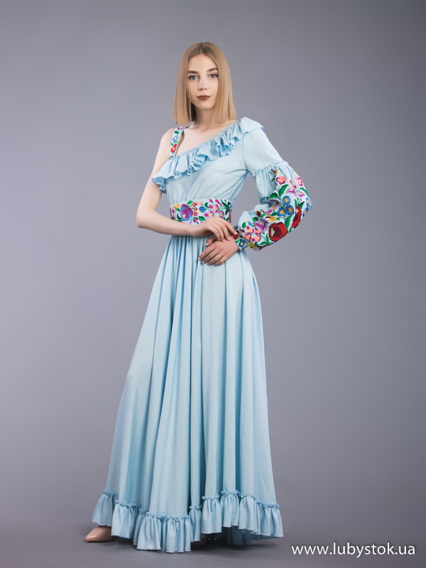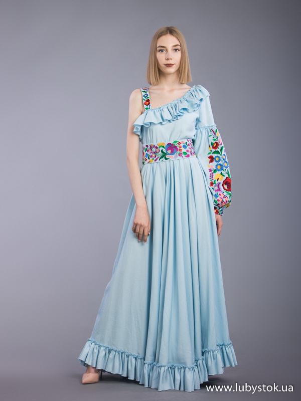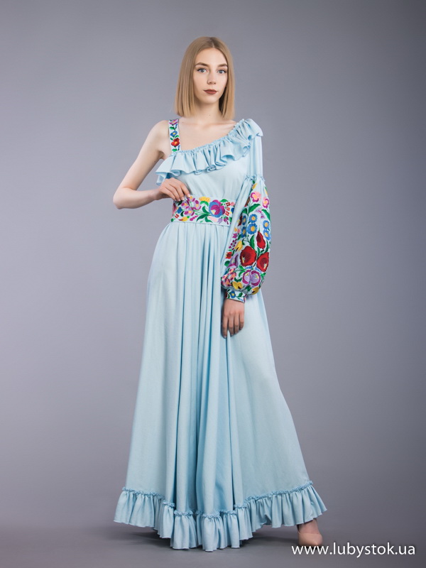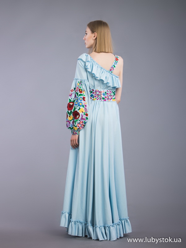 Вишита сукня гладдю ЖПВ 73-1. Завдяки візерунку сукня має оригінальний вигляд. Стиль cукні сучасний з традиційними мотивами на блакитному льоні. Плаття-вишиванка вишите гладдю зеленими, червоними, жовтими, синіми та фіолетовими нитками з віскози. Візерунок вишивки рослинний у вигляді ківітів. Рукав довгий. Цю сукню можна одягнути як у святкові так і у дні коли хочеться мати особливий вигляд.
