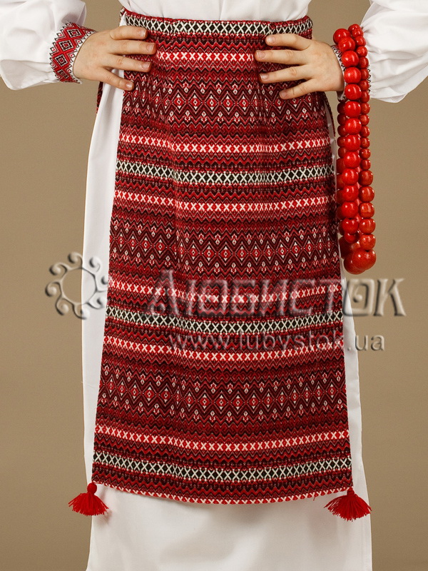 Українськи вишитий фартух Ф1-1. Ткана вишивка червоного кольору. Цей фартух чудово додасть традиційного вигляду українському націоналоному вбраню.