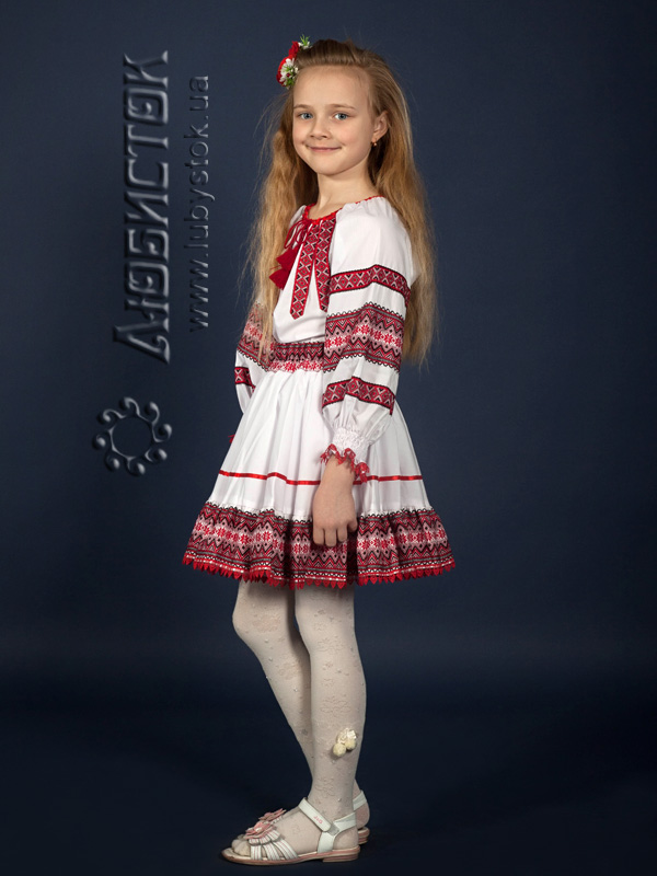 Український вишитий костюм для дівчинки - українська вишиванка - модель ЖК 81-78 : вишиванка ЖБ 66-78, вишита спідниця С 1-78. Вишивка ткана, червоними, чорними та білими акриловими нитками. Візерунок 78 - геометричний. Тканина якісна біла сорочкова.