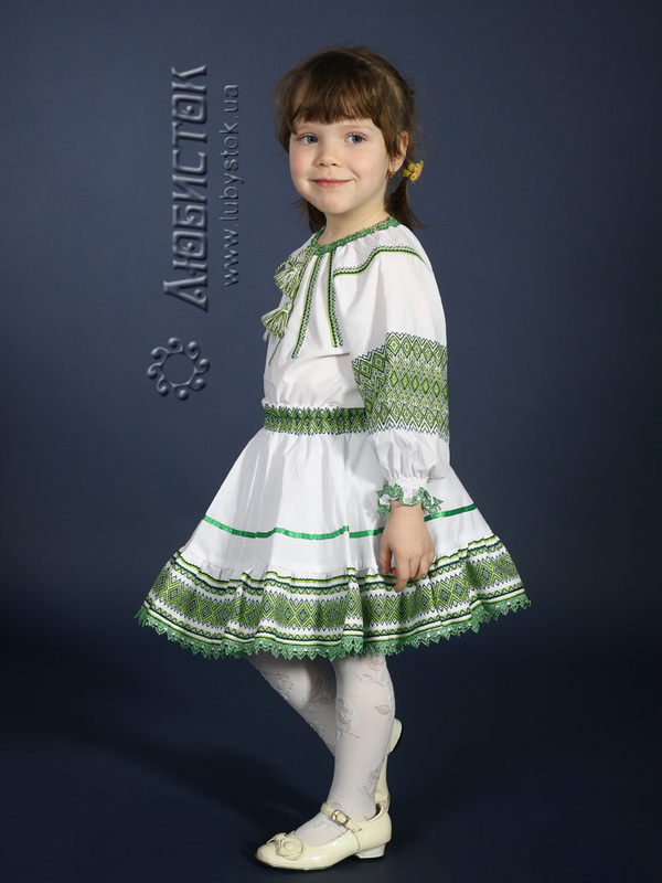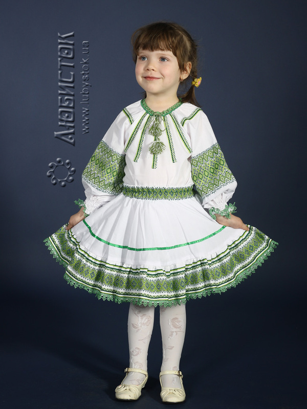 Український вишитий костюм для дівчинки - українська вишиванка - модель ЖК 83-15 : вишиванка ЖБ 87-15, вишита спідниця С 1-15. Вишивка ткана, зеленими та білими акриловими нитками. Візерунок 15 - геометричний. Тканина якісна біла сорочкова.