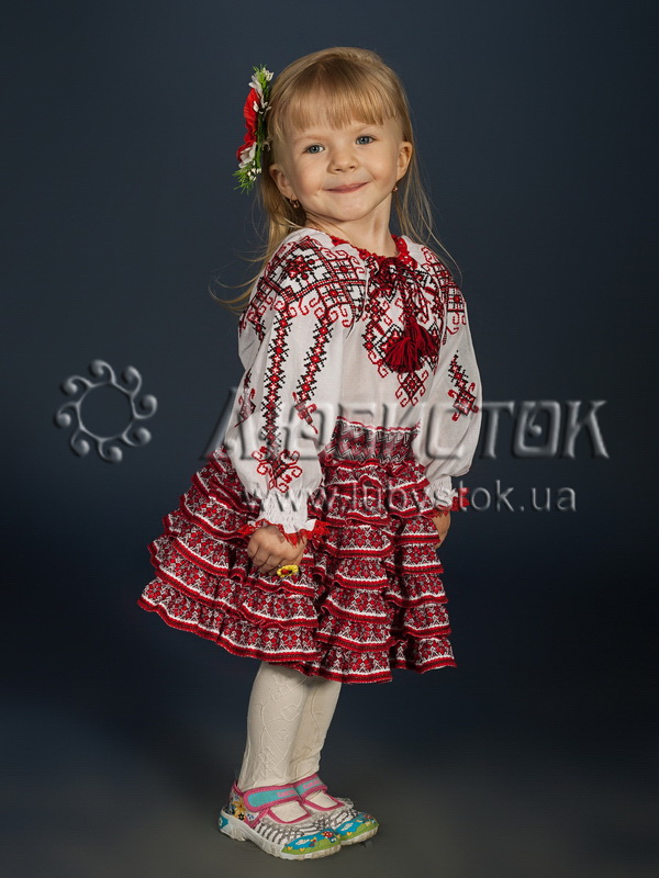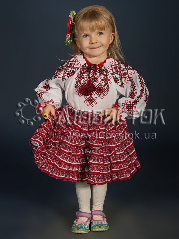 Український вишитий костюм для дівчинки ЖКВ 7-1. Цей костюмчик складається з вишиванки хрестиком ЖБВ 14-1 та спіднички з рюшечками. Тканина біла домоткана. Вишивка червоно-чорного кольору. Вишиванку і спідницю можна носити як разом, так і окремо. Вишита блузочка з чудовим яскравим вишитим візерунком та спідничка з рюшками, що додає їй пишності. Цей костюмчик чудово підійде для будь яких урочистих та святкових подій, а також для творчих виступів у дитячому садочку та школі. Купуйте вишитий костюм для дівчинки у нашому інтеренет-магазині www.lubystok.ua - не пожалієте, і подаруєте радість як собі, так і вашій доньці!