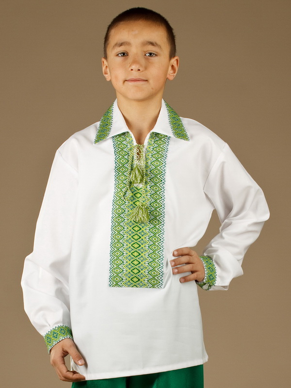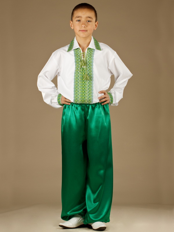 Український вишитий костюм для хлопчика - українська вишиванка - модель КХ 2-15 : вишиванка ЧС 4-15, шаровари ШР 3. Вишивка ткана, зеленими акриловими нитками. Візерунок 15 - геометричний. Тканина сорочки якісна біла сорочкова.