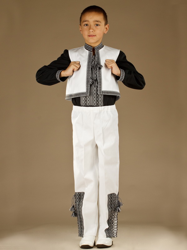 Український вишитий костюм для хлопчика - українська вишиванка - модель КХ 5-5 : вишиванка ЧС 7-5, вишита камізелька КМ 3-5, вишиті штани Ш 2-5. Вишивка ткана, чорними та білими акриловими нитками. Візерунок 5 - геометричний. Тканина сорочки якісна чорна сорочкова. Тканина камізельки та штанів - костюмна, біла.