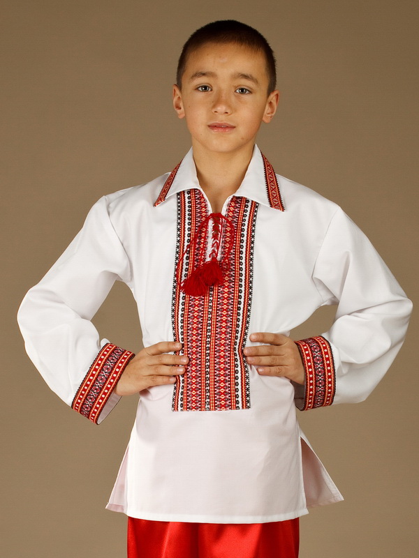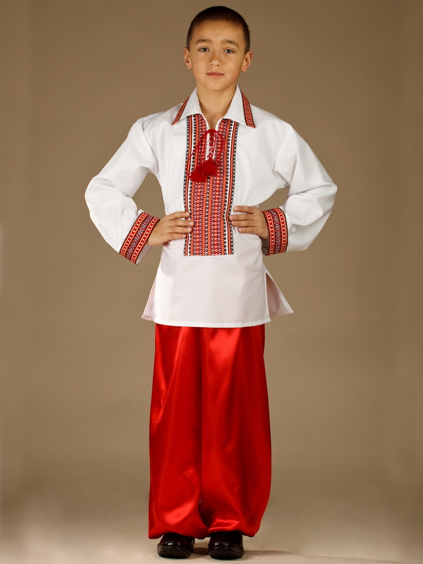 Український вишитий костюм для хлопчика - українська вишиванка - модель КХ 7-2 : вишиванка ЧС 22-2, шаровари ШР 1. Вишивка ткана, червоними, чорними та білими акриловими нитками. Візерунок 2 - геометричний. Тканина сорочки якісна біла сорочкова.