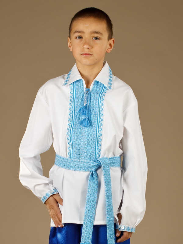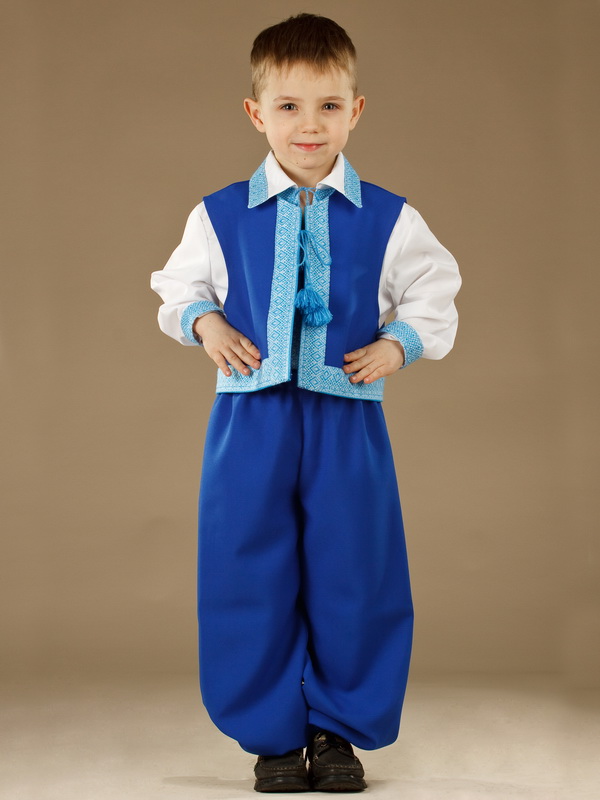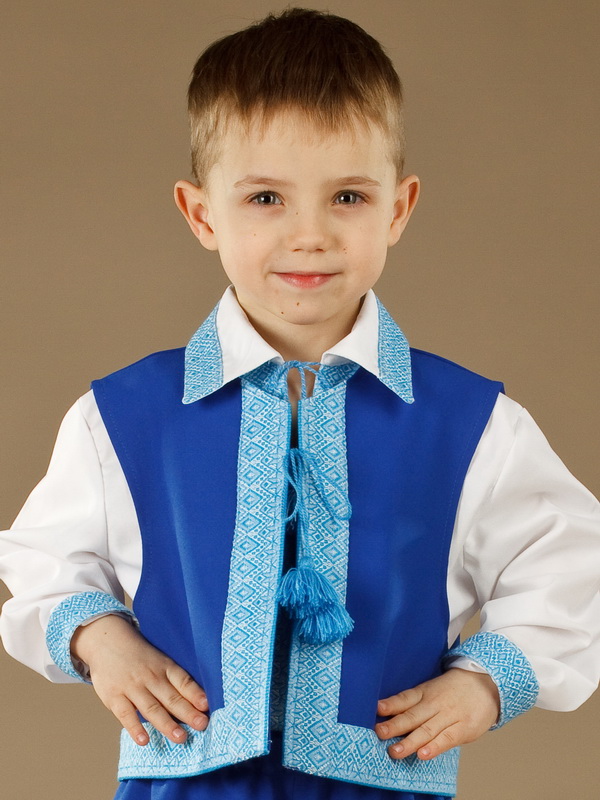 Український вишитий костюм для хлопчика - українська вишиванка - модель КХ 9-12 : вишиванка ЧС 4-12, шаровари ШР 2, камізелька К 5-12. Вишивка ткана, блакитними акриловими нитками. Візерунок 12 - геометричний. Тканина сорочки якісна біла сорочкова.