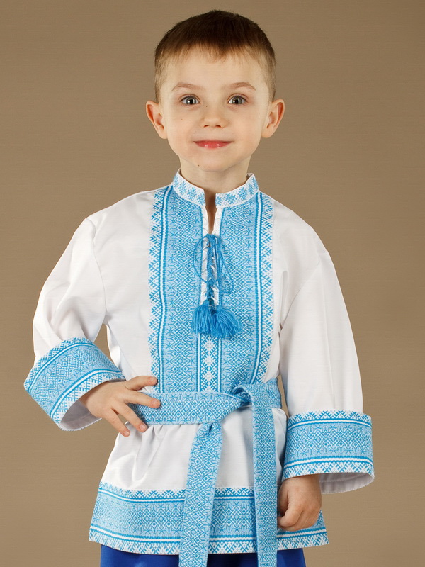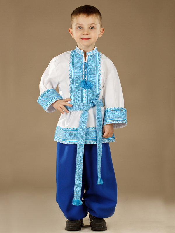 Український вишитий костюм для хлопчика - українська вишиванка - модель КХ 10-12 : вишиванка ЧС 8-12, шаровари ШР 2, пояс-крайка К 1-12. Вишивка ткана, блакитними акриловими нитками. Візерунок 12 - геометричний. Тканина сорочки якісна біла сорочкова.