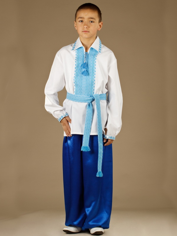 Український вишитий костюм для хлопчика - українська вишиванка - модель КХ 12-12 : вишиванка ЧС 4-12, шаровари ШР 2, пояс-крайка К 1-12. Вишивка ткана, блакитними акриловими нитками. Візерунок 12 - геометричний. Тканина сорочки якісна біла сорочкова.