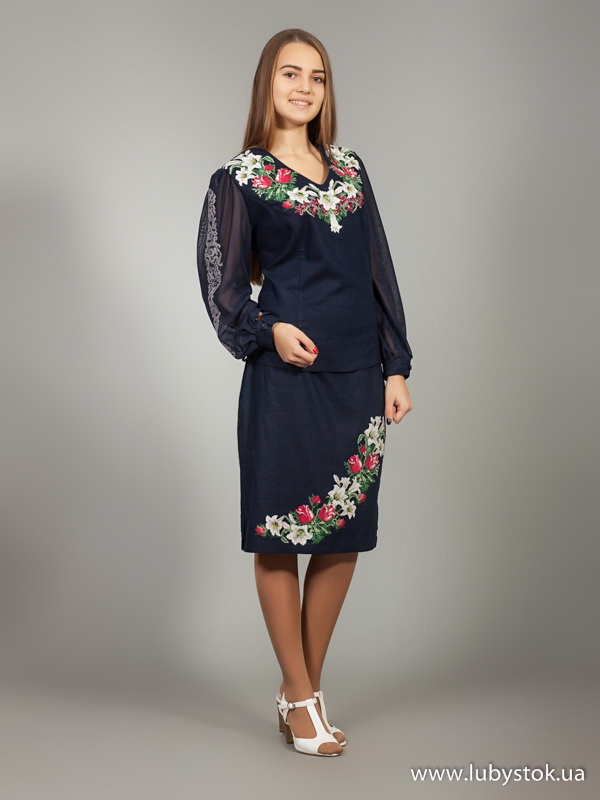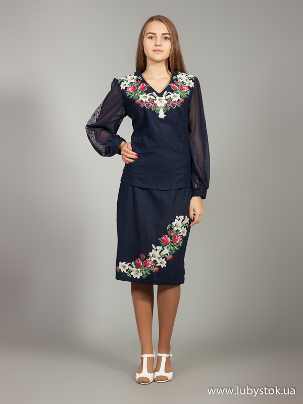 Вишитий модний жіночий костюм ЖКВ 1-1 з квітами в традиційних мотивах української вишивки. Вишивка хрестиком, кольоровими нитками по темно-синьому льоні. Комплект складається з вишитої хрестиком блузи та спідниці (Блуза: ЖБВ 22-1), які також чудово можуть виступати цілком незалежними елементами вашого гардеробу. Неймовірної краси вишита хрестиком жіноча блуза задумана нашими дизайнерами у витонченому дизайні. Такий образ нікого не залишить байдужим.