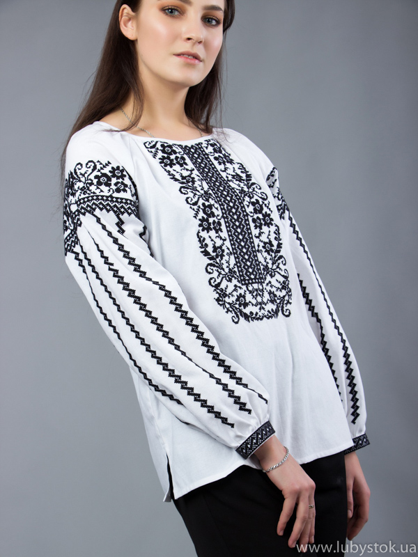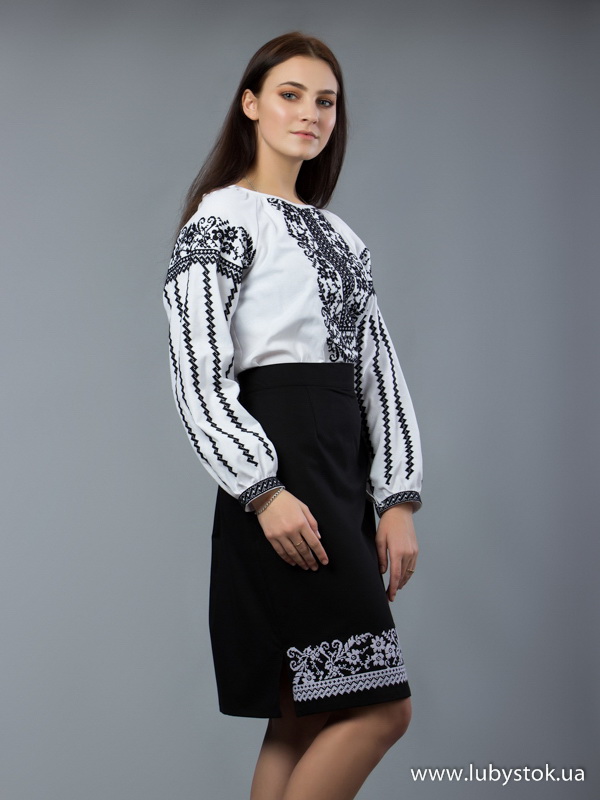 Вишитий модний строгий жіночий костюм ЖКВ 4-1 з традиційними мотивами для підкреслення жіночої ніжності та краси. Вишивка хрестиком, чорними нитками по білій блузі та білими по чорній спідниці. Комплект складається з вишитої хрестиком блузи та спідниці (Блуза: ЖБВ 36-1), які також чудово можуть виступати цілком незалежними елементами вашого гардеробу. Неймовірної краси вишита хрестиком жіноча блуза задумана нашими дизайнерами у витонченому дизайні. Такий образ нікого не залишить байдужим.