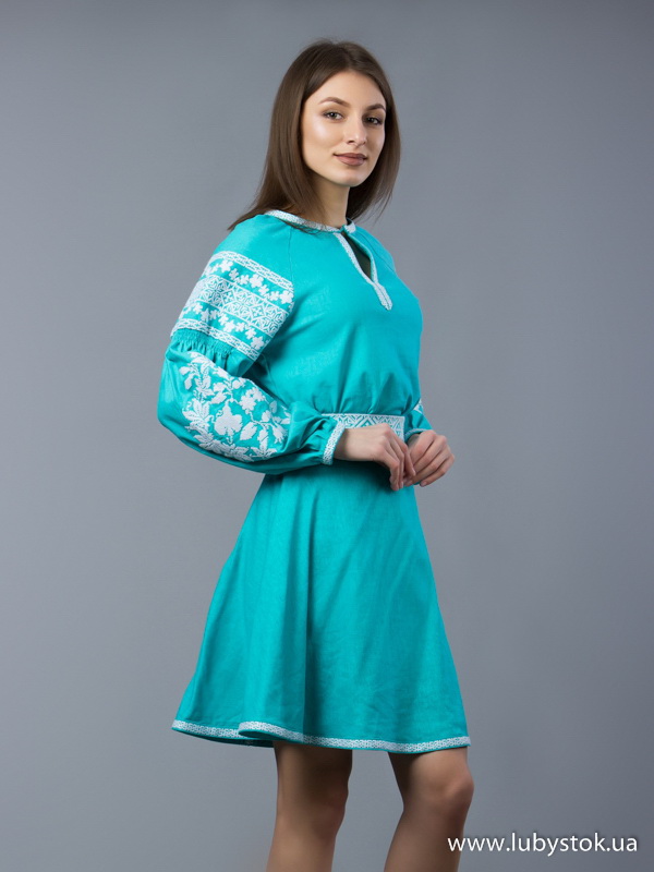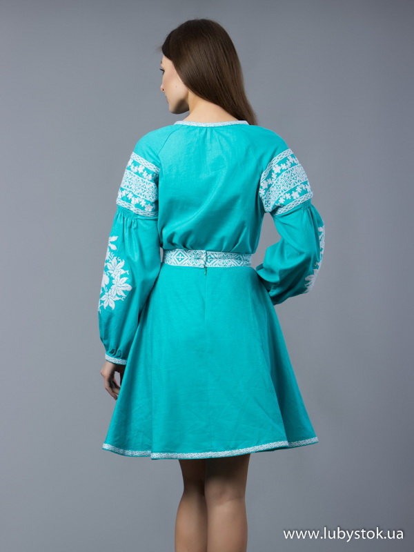 Вишитий модний жіночий костюм ЖКВ 5-2 з традиційними мотивами для підкреслення жіночої ніжності та краси. Вишивка хрестиком, білими нитками по бірюзовому льоні. Комплект складається з вишитої хрестиком блузи та спідниці (Блуза: ЖБВ 28-6), які також чудово можуть виступати цілком незалежними елементами вашого гардеробу. Неймовірної краси вишита хрестиком жіноча блуза задумана нашими дизайнерами у витонченому дизайні. Такий образ нікого не залишить байдужим.