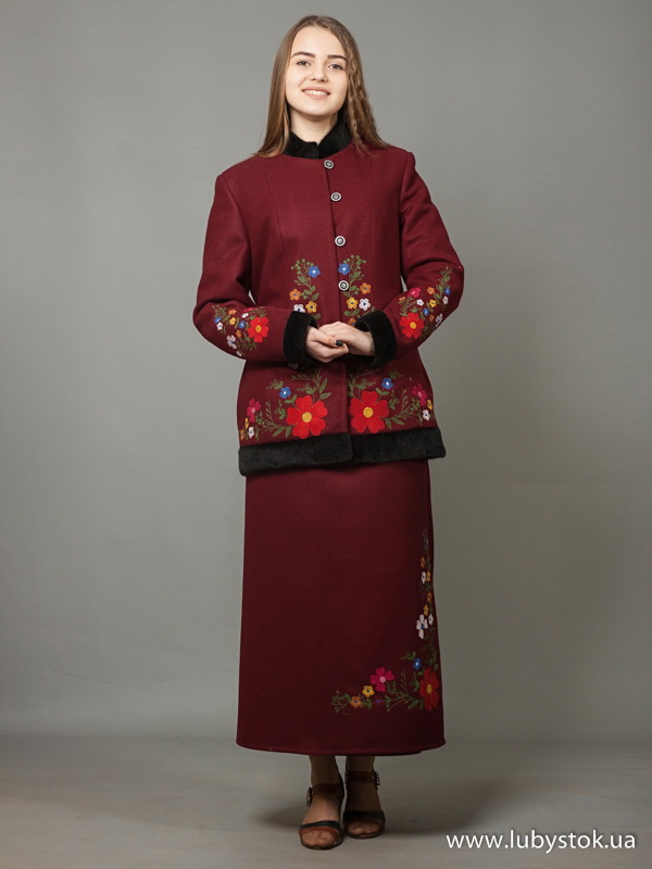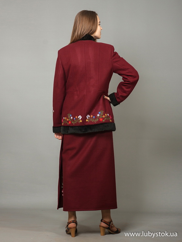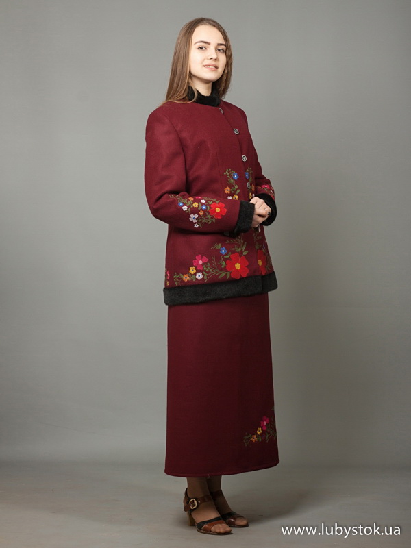 Зимовий український вишитий жіночий костюм модель ЖКВ 3-1. Цей костюм пошито з пальтової тканини і він складається з двох елементів: вишитий жіночий жупан з штучним хутром і стьоганою підкладкою та вишита спідниця.
