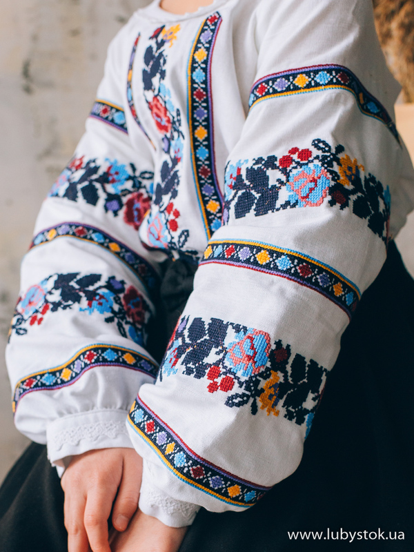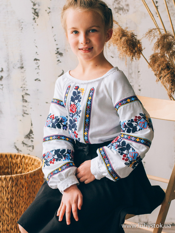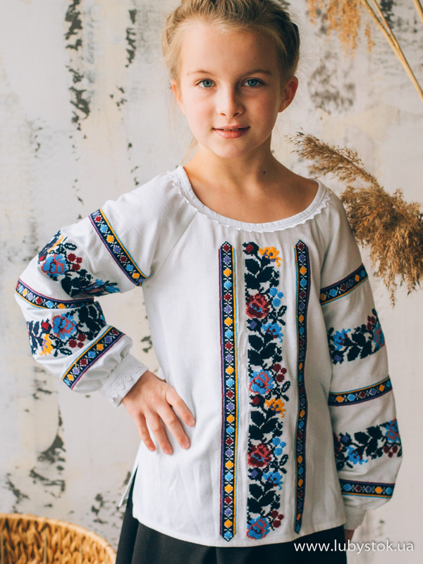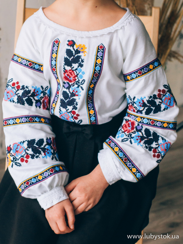 Дитяча вишита блуза з барвистою вишивкою - українська вишиванка для дівчинки хрестиком B-079-01-d - www.lubystok.ua.