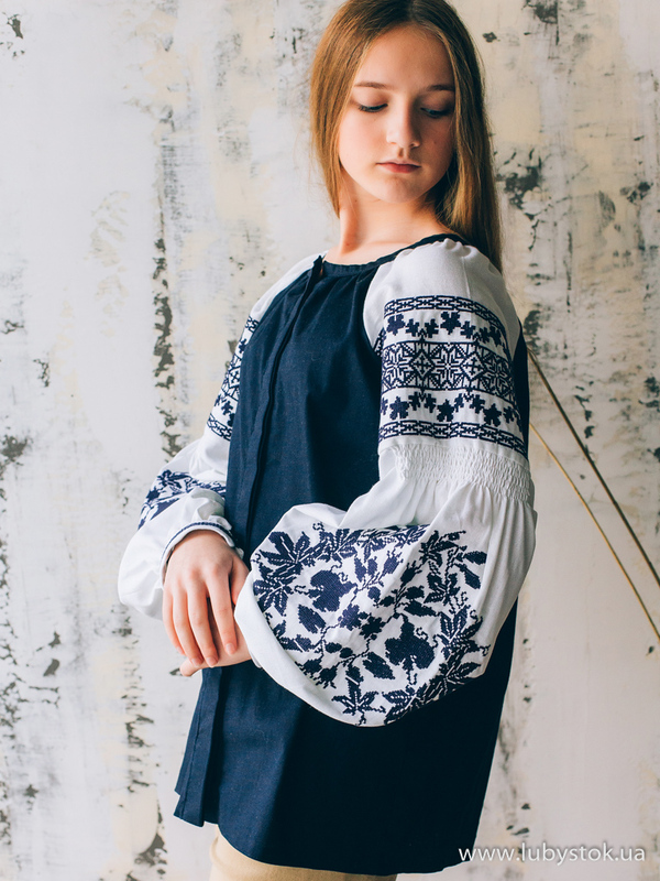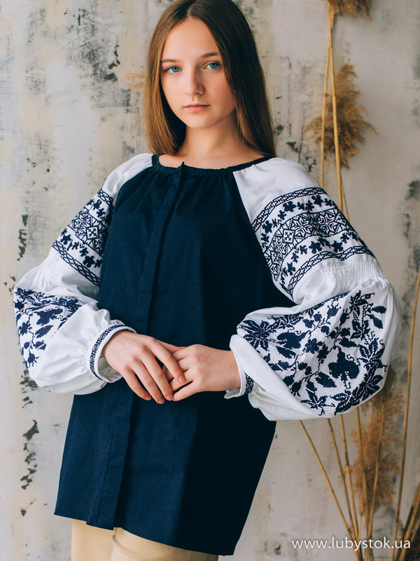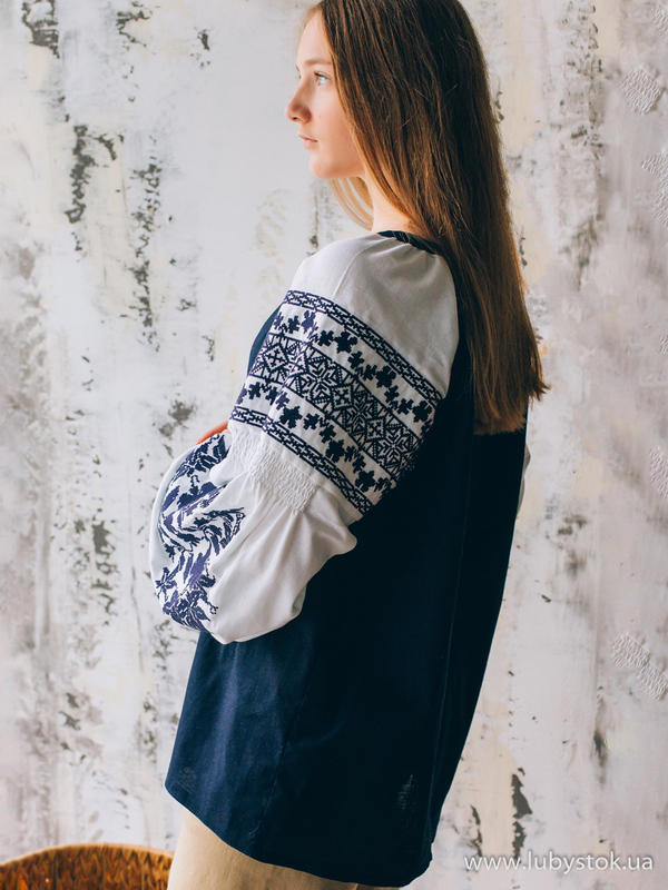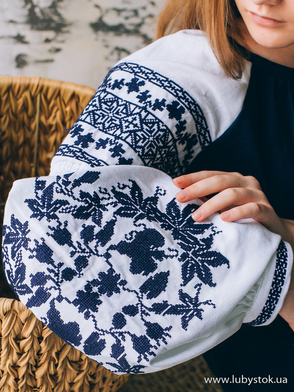 Вишиванка хрестиком - вишита жіноча сорочка B-081-01. Завдяки фасону та кольору блуза виглядає дуже оригінальною. Стиль традиційний з білими рукавами з темно-синьою вишивкою та темно-синім льоном. Вишиванка вишита хрестиком темно-синіми акриловими нитками. Виконана рослинно-геометричним візерунком. Чудово підійде як для святкових так і для днів коли хочеться виглядати по особливому.