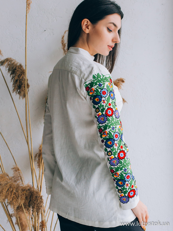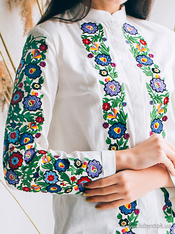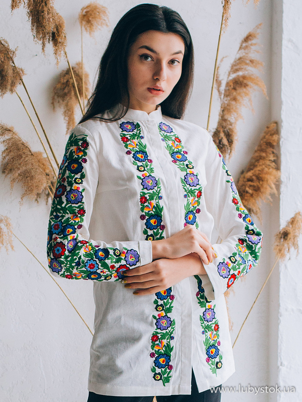Жіноча вишиванка гладдю B-082-01. Ця блузка має дуже ніжний та оригінальний вигляд. Стиль сорочки сучасний у діловому стилі. Вишиванка вишита гладдю зеленими, червоними, блакитними, жовтими та фіолетовими акриловими нитками. Візерунок вишивки рослинний у вигляді колорових квітів. Вишивка розміщена на грудях у дві полоси та повздовж рукава. Рукав в три чверті. Цю сорочку можна одягати на будь-які події і ваш день буде особливим.