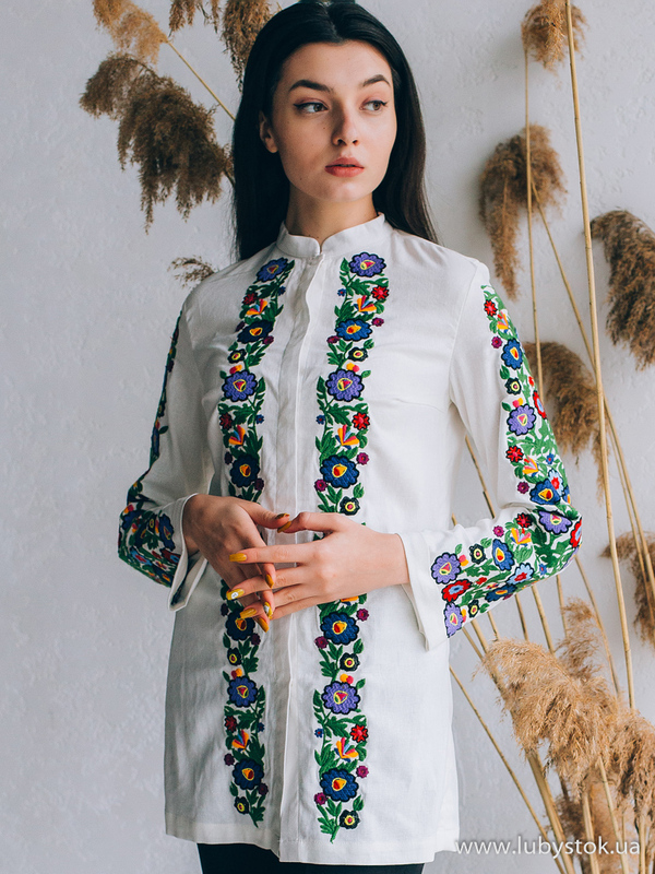 Чудова дизайнерська вишита блуза гладдю з сучасними мотивами крою в українському стилі з рослинним орнаментом - www.lubystok.ua.