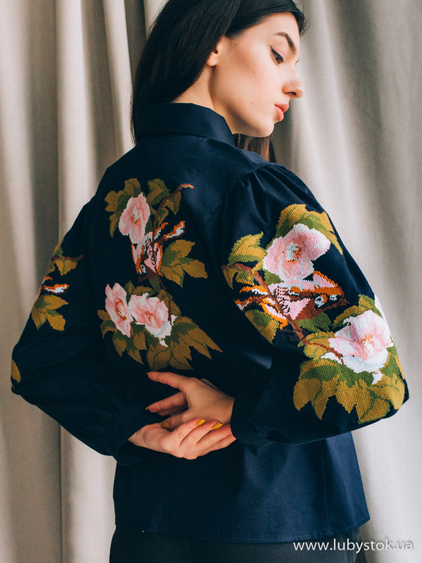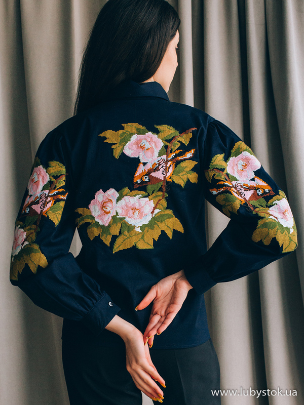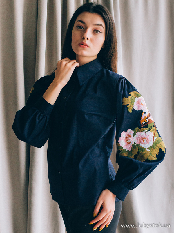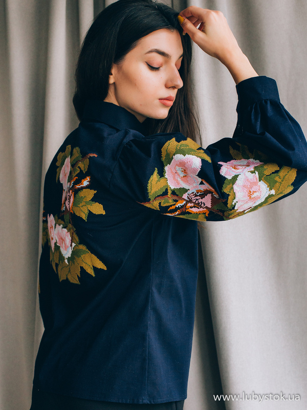 Жіноча вишиванка із вишитими хрестиком квітами на спині на темно-синьому льоні. Вишита жіноча сорочка B-085-01 в діловому стилі.