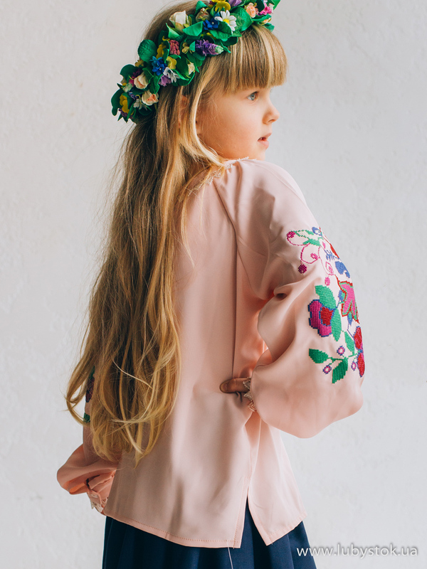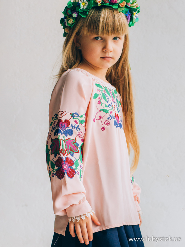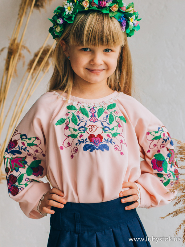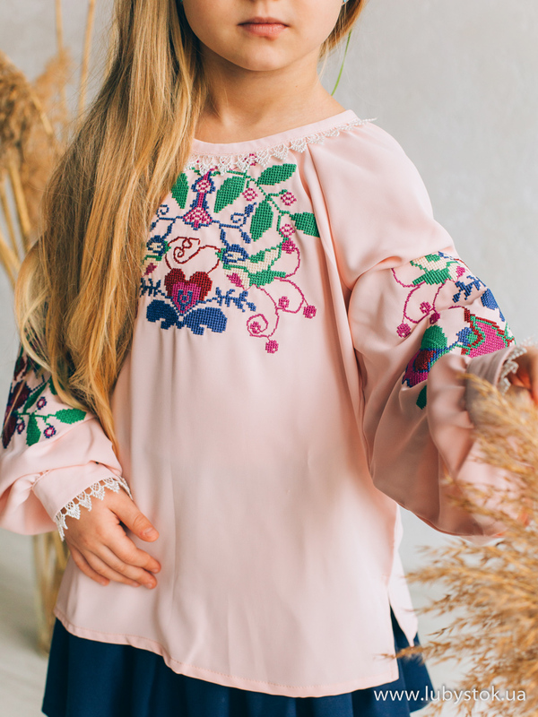 Дитяча вишита блуза з рослинним орнаментом - українська вишиванка для дівчинки хрестиком B-089-01-d - www.lubystok.ua.
