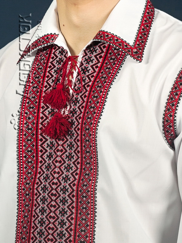 Вишиванка - вишита чоловіча сорочка ЧС 10-73. Крій - сучасний. Комір - відкладний, вишитий по краям. Горловина на петлях зі шнурком та кутасами. Краї рукавів з вишивкою на манжет і ґудзик. Особливістю цієї сорочки є вишивка на з`єднані рукава та сорочки. Вишивка ткана, червоними, чорними та білими акриловими нитками. Візерунок 73 - геометричний. Тканина якісна біла сорочкова, можливе виготовлення із 100% бавовни або 100% льону.