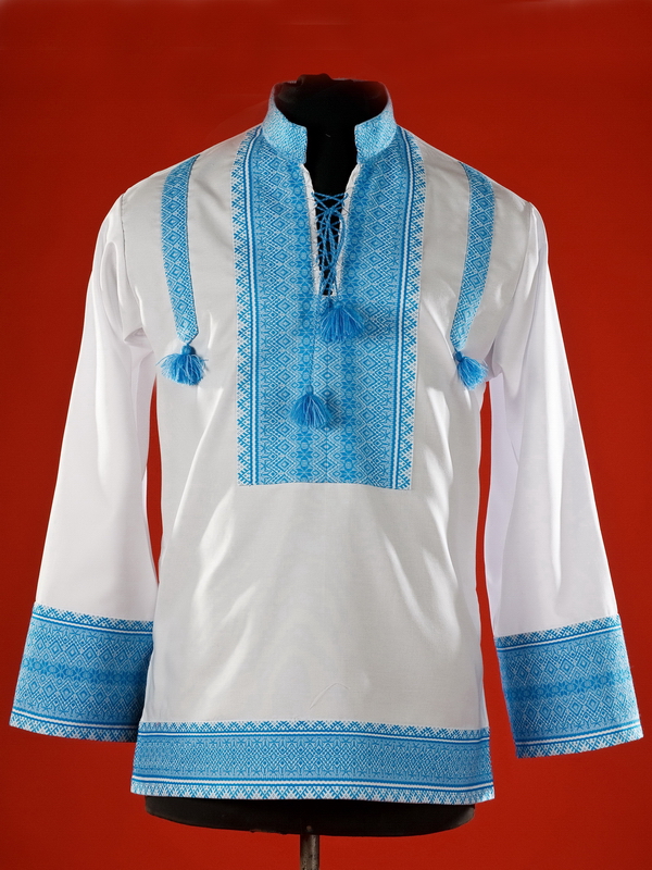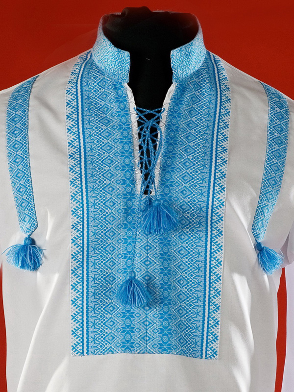 Вишиванка - вишита чоловіча сорочка ЧС 11-12. Крій - український, традиційний, сценічний. Комір - вишита стійка. Горловина на петлях зі шнурком та кутасами. Краї рукавів - вишиті труби. Особливістю цієї сорочки є вишивка на плечах з кутасами та обшитий вишивкою широкою полосою низ сорочки. Вишивка ткана, блакитними та білими акриловими нитками. Візерунок 12 - геометричний. Тканина якісна біла сорочкова, можливе виготовлення із 100% бавовни або 100% льону.