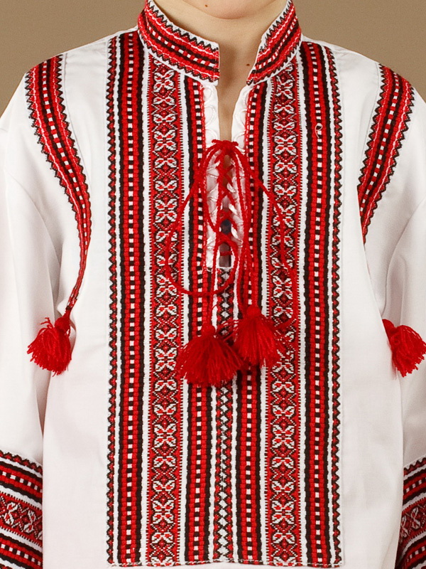 Вишиванка - вишита чоловіча сорочка ЧС 11-9. Крій - український, традиційний, сценічний. Комір - вишита стійка. Горловина на петлях зі шнурком та кутасами. Краї рукавів - вишиті труби. Особливістю цієї сорочки є вишивка на плечах з кутасами та обшитий вишивкою широкою полосою низ сорочки. Вишивка ткана, червоними, чорними та білими акриловими нитками. Візерунок 9 - геометричний. Тканина якісна біла сорочкова, можливе виготовлення із 100% бавовни або 100% льону.