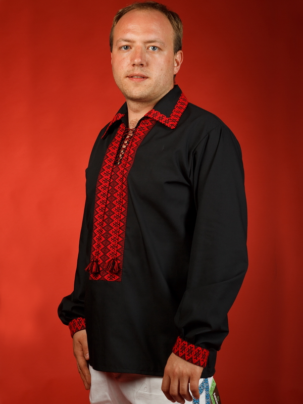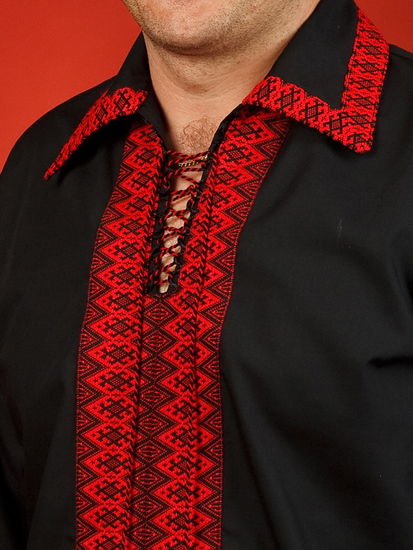 Вишиванка чорна - вишита чоловіча сорочка ЧС 12-18. Крій - сучасний. Комір - відкладний, вишитий по краям. Горловина на петлях зі шнурком та кутасами. Краї рукавів з вишивкою на манжет і ґудзик. Вишивка ткана, червоними та чорними акриловими нитками. Візерунок 18 - геометричний. Тканина якісна чорна сорочкова, можливе виготовлення із 100% бавовни або 100% льону.