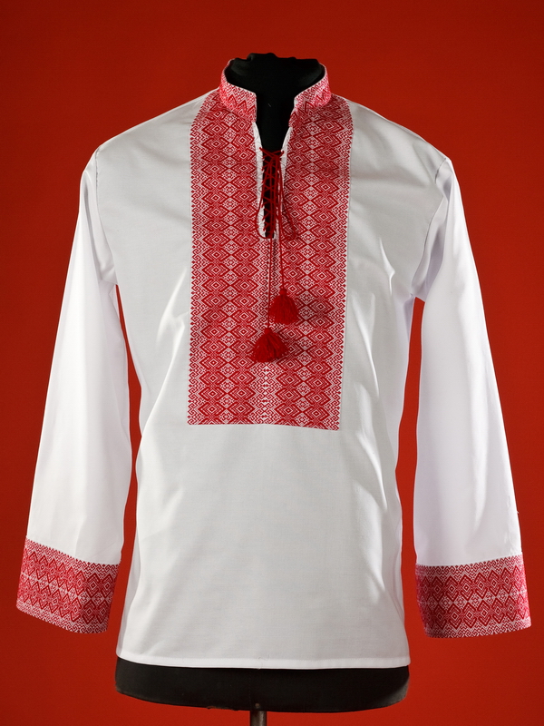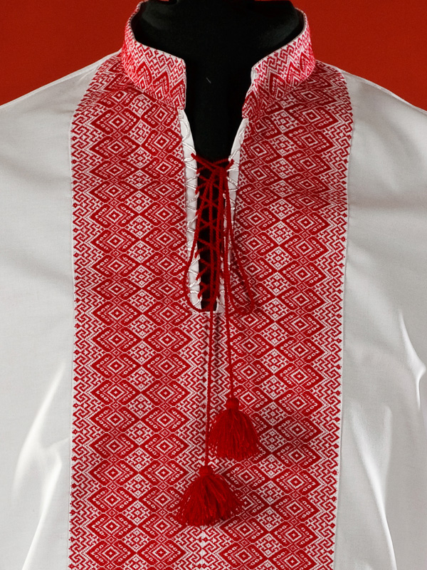 Вишиванка - вишита чоловіча сорочка ЧС 13-11. Крій - український, традиційний. Комір - вишита стійка. Горловина на петлях зі шнурком та кутасами. Краї рукавів - труби з вишивкою, без манжета. Вишивка ткана, червоними та білими акриловими нитками. Візерунок 11 - геометричний. Тканина якісна біла сорочкова, можливе виготовлення із 100% бавовни або 100% льону.