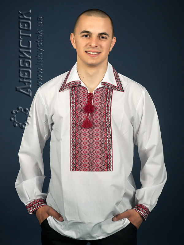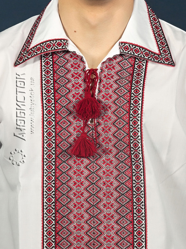 Вишиванка - вишита чоловіча сорочка ЧС 14-60. Крій - сучасний. Комір - відкладний, вишитий по краям. Горловина на петлях зі шнурком та кутасами. Краї рукавів з вишивкою на манжет і ґудзик. Вишивка ткана, червоними, чорними та білими акриловими нитками. Візерунок 60 - геометричний. Тканина якісна біла сорочкова, можливе виготовлення із 100% бавовни або 100% льону.