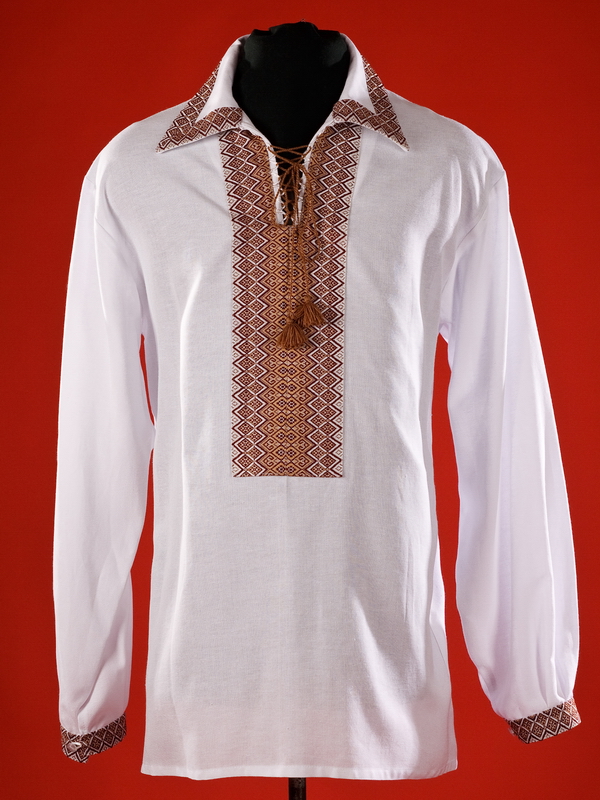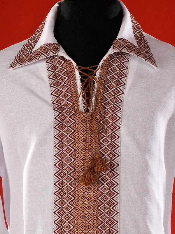 Вишиванка - вишита чоловіча сорочка ЧС 14-7. Крій - сучасний. Комір - відкладний, вишитий по краям. Горловина на петлях зі шнурком та кутасами. Краї рукавів з вишивкою на манжет і ґудзик. Вишивка ткана, коричневими акриловими нитками. Візерунок 7 - геометричний. Тканина якісна біла сорочкова, можливе виготовлення із 100% бавовни або 100% льону.