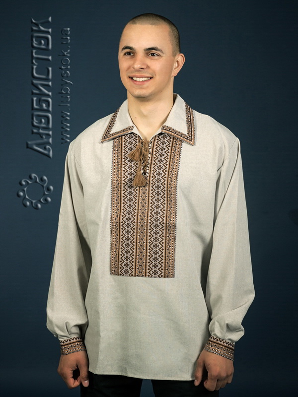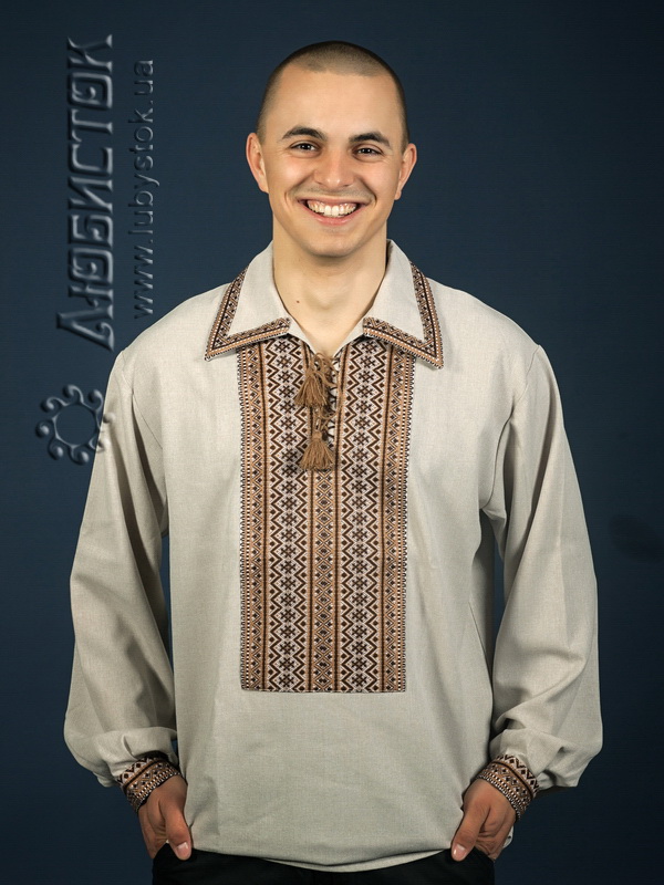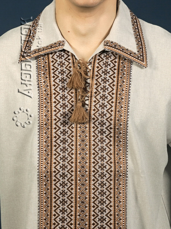 Вишиванка - вишита чоловіча сорочка на льоні 14-76L. Крій - сучасний. Комір - відкладний, вишитий по краям. Горловина на петлях зі шнурком та кутасиками. Краї рукавів з вишивкою на манжет і ґудзик. Вишивка ткана, коричневими та золотистими акриловими нитками. Візерунок 76 - геометричний. Тканина стреч-льон, можливе виготовлення із 100% льону.