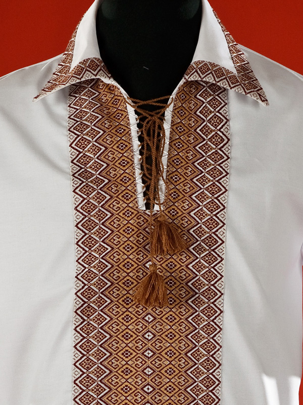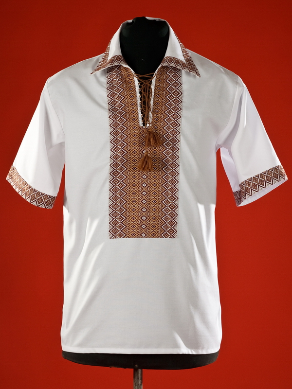 Вишиванка літня - вишита чоловіча сорочка ЧС 15-7. Крій - сучасний. Комір - відкладний, вишитий по краям. Горловина на петлях зі шнурком та кутасами. Рукав короткий, вишитий по краям. Вишивка ткана, коричневими акриловими нитками. Візерунок 7 - геометричний. Тканина якісна біла сорочкова, можливе виготовлення із 100% бавовни або 100% льону.