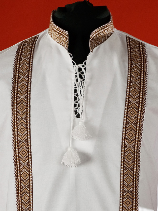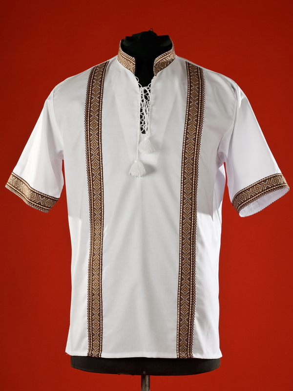 Вишиванка оригінальна літня - вишита чоловіча сорочка ЧС 17-14. Стиль - сучасний. Комір - вишита стійка. Горловина на петлях зі шнурком та кутасами. Рукав короткий, вишитий по краям. Вишивка ткана, коричневими акриловими нитками. Візерунок 14 - геометричний. Тканина якісна біла сорочкова, можливе виготовлення із 100% бавовни або 100% льону.