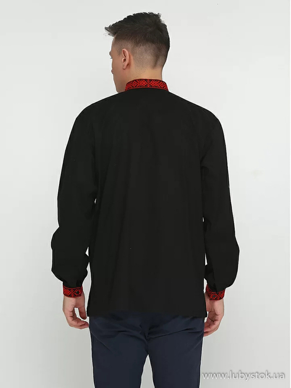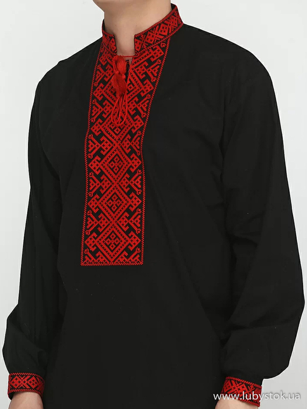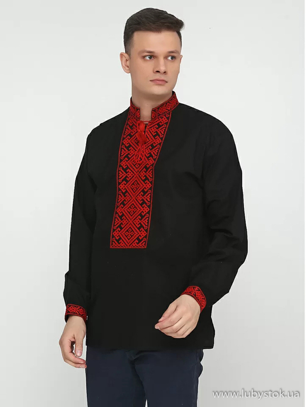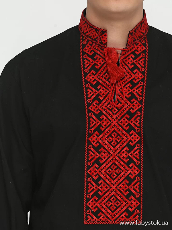 Вишиванка - вишита хрестиком чоловіча сорочка на льоні С 2-1L. Крій - традиційний. Комір - вишита стійка. Горловина на петлях зі шнурком та кутасиками. Краї рукавів з вишивкою на манжет і ґудзик. Вишивка хрестиком, червоними акриловими нитками. Тканина 100% льон.