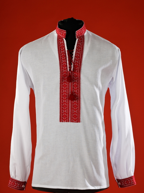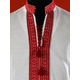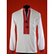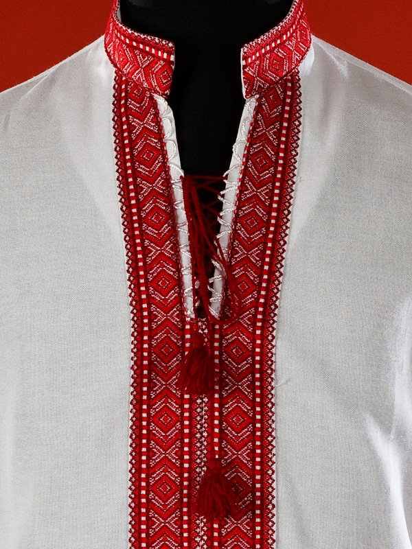 Вишиванка - вишита чоловіча сорочка ЧС 2-13. Крій - український, традиційний. Комір - вишита стійка. Горловина на петлях зі шнурком та кутасами. Краї рукавів з вишивкою на манжет і ґудзик. Вишивка ткана, червоними та білими акриловими нитками. Візерунок 13 - геометричний. Тканина якісна біла сорочкова, можливе виготовлення із 100% бавовни або 100% льону.