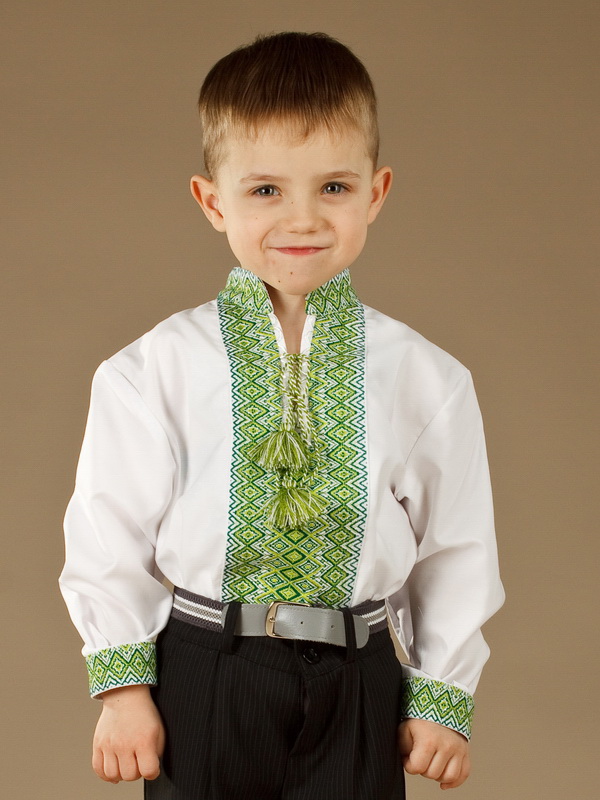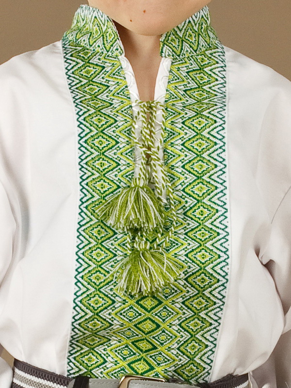 Вишиванка - вишита чоловіча сорочка ЧС 2-15. Крій - український, традиційний. Комір - вишита стійка. Горловина на петлях зі шнурком та кутасами. Краї рукавів з вишивкою на манжет і ґудзик. Вишивка ткана, зеленими та білими акриловими нитками. Візерунок 15 - геометричний. Тканина якісна біла сорочкова, можливе виготовлення із 100% бавовни або 100% льону.