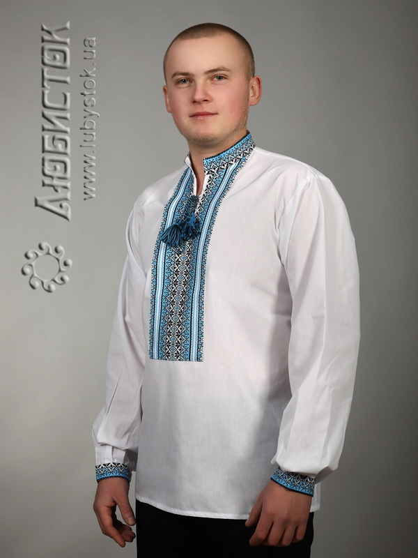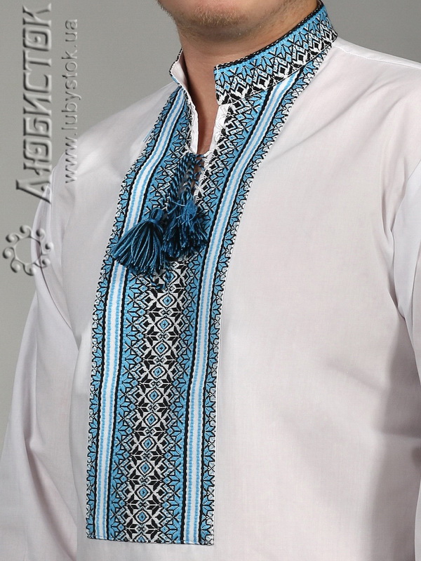 Вишиванка - вишита чоловіча сорочка ЧС 2-23. Крій - український, традиційний. Комір - вишита стійка. Горловина на петлях зі шнурком та кутасами. Краї рукавів з вишивкою на манжет і ґудзик. Вишивка ткана, блакитними, чорними та білими акриловими нитками. Візерунок 23 - геометричний. Тканина якісна біла сорочкова, можливе виготовлення із 100% бавовни або 100% льону.