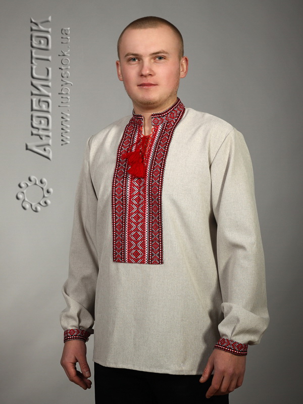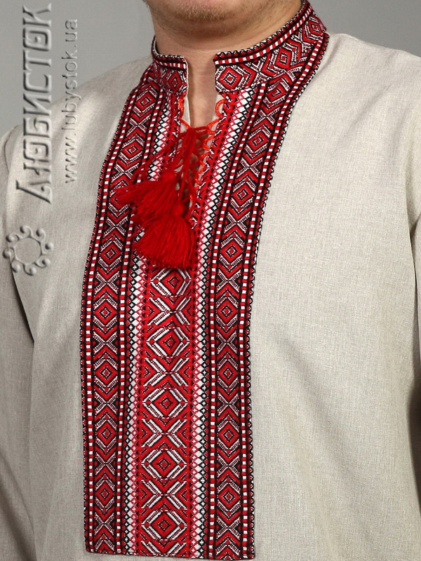 Вишиванка - вишита чоловіча сорочка на льоні ЧС 2-26L. Крій - традиційний. Комір - вишита стійка. Горловина на петлях зі шнурком та кутасиками. Краї рукавів з вишивкою на манжет і ґудзик. Вишивка ткана, червоними та чорними акриловими нитками. Візерунок 26 - геометричний. Тканина стреч-льон, можливе виготовлення із 100% льону.