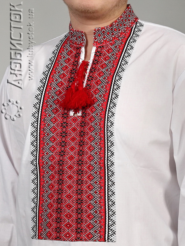 Вишиванка - вишита чоловіча сорочка ЧС 2-27. Крій - український, традиційний. Комір - вишита стійка. Горловина на петлях зі шнурком та кутасами. Краї рукавів з вишивкою на манжет і ґудзик. Вишивка ткана, червоними, чорними та білими акриловими нитками. Візерунок 27 - геометричний. Тканина якісна біла сорочкова, можливе виготовлення із 100% бавовни або 100% льону.