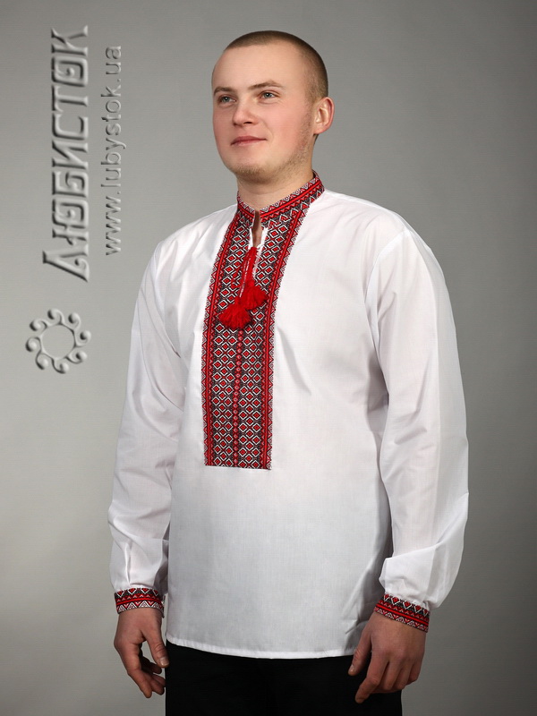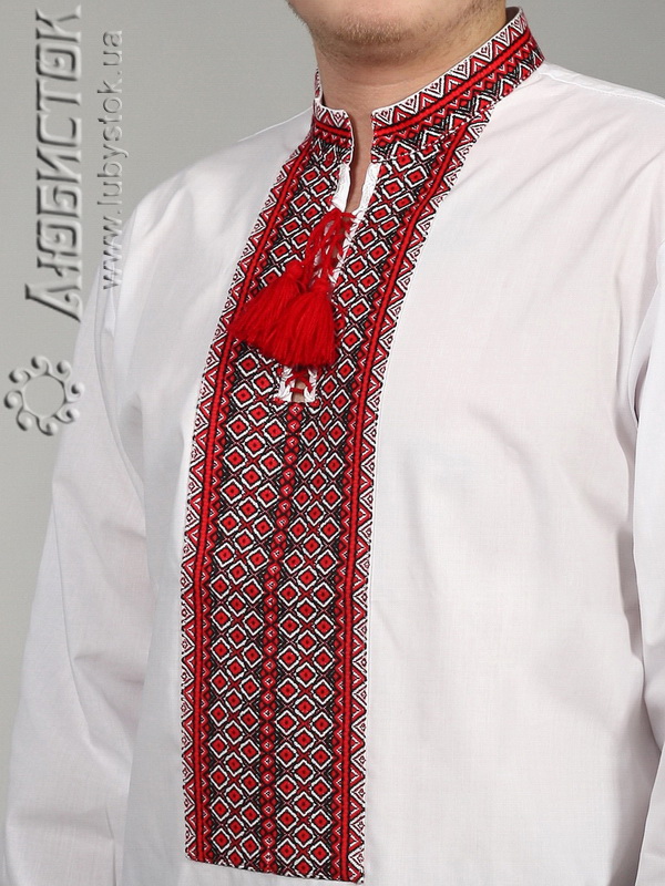 Вишиванка - вишита чоловіча сорочка ЧС 2-63. Крій - український, традиційний. Комір - вишита стійка. Горловина на петлях зі шнурком та кутасами. Краї рукавів з вишивкою на манжет і ґудзик. Вишивка ткана, червоними, чорними та білими акриловими нитками. Візерунок 63 - геометричний. Тканина якісна біла сорочкова, можливе виготовлення із 100% бавовни або 100% льону.