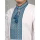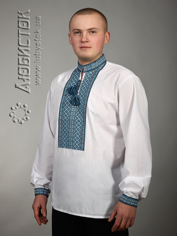 Вишиванка - вишита чоловіча сорочка ЧС 2-68. Крій - український, традиційний. Комір - вишита стійка. Горловина на петлях зі шнурком та кутасами. Краї рукавів з вишивкою на манжет і ґудзик. Вишивка ткана, блакитними, чорними та білими акриловими нитками. Візерунок 68 - геометричний. Тканина якісна біла сорочкова, можливе виготовлення із 100% бавовни або 100% льону.