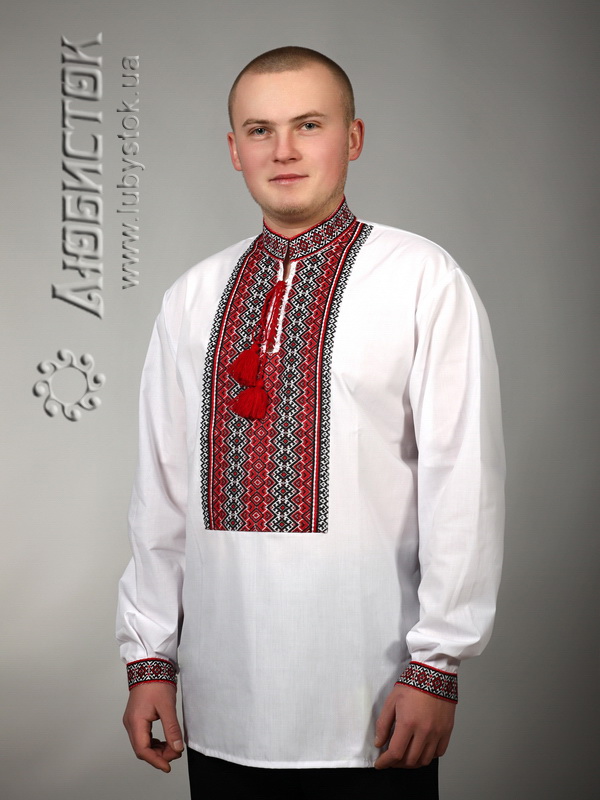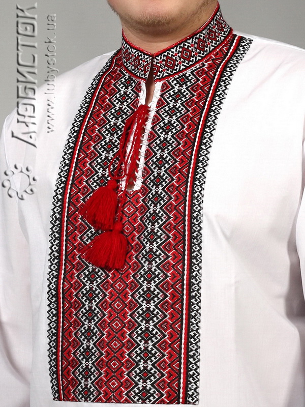 Вишиванка - вишита чоловіча сорочка ЧС 2-69. Крій - український, традиційний. Комір - вишита стійка. Горловина на петлях зі шнурком та кутасами. Краї рукавів з вишивкою на манжет і ґудзик. Вишивка ткана, червоними, чорними та білими акриловими нитками. Візерунок 69 - геометричний. Тканина якісна біла сорочкова, можливе виготовлення із 100% бавовни або 100% льону.