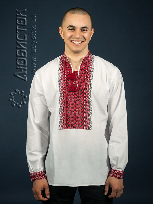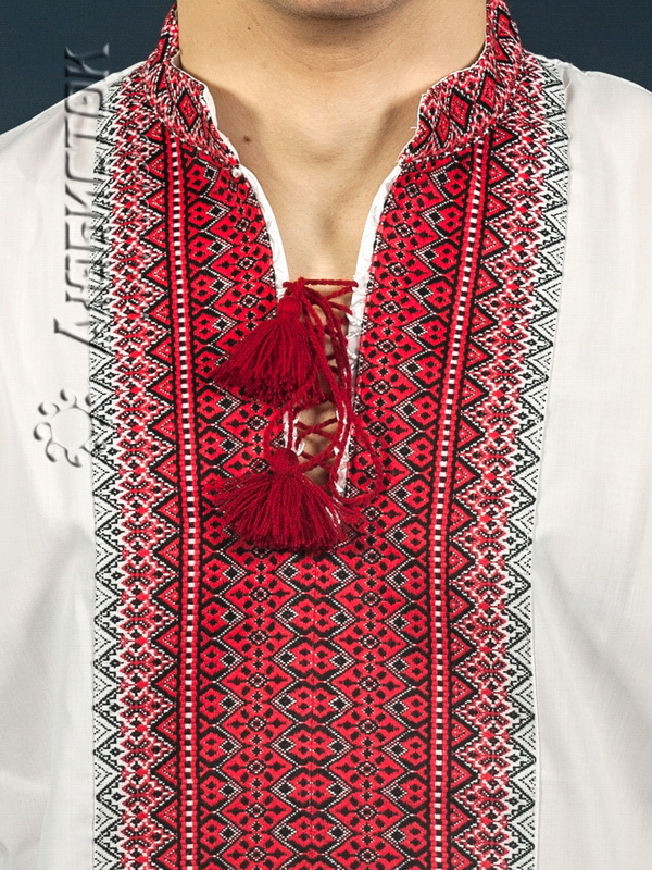 Вишиванка - вишита чоловіча сорочка ЧС 2-72. Крій - український, традиційний. Комір - вишита стійка. Горловина на петлях зі шнурком та кутасами. Краї рукавів з вишивкою на манжет і ґудзик. Вишивка ткана, червоними, чорними та білими акриловими нитками. Візерунок 72 - геометричний. Тканина якісна біла сорочкова, можливе виготовлення із 100% бавовни або 100% льону.