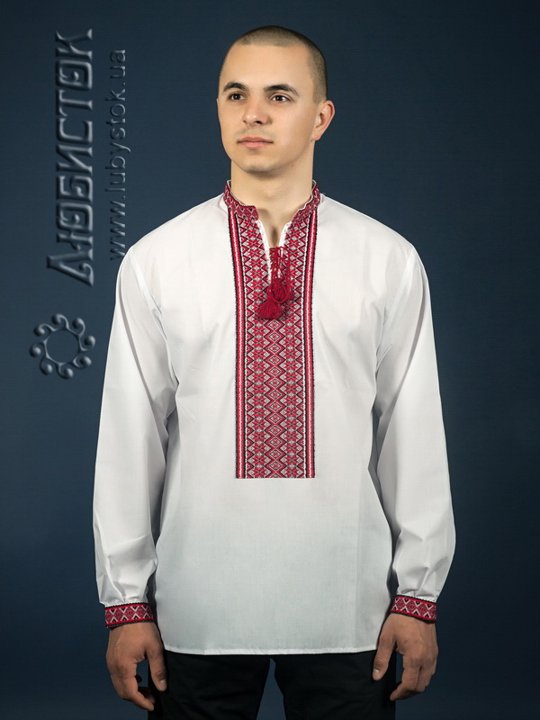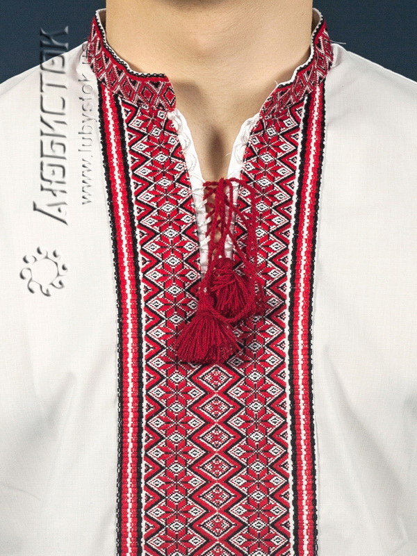 Вишиванка - вишита чоловіча сорочка ЧС 2-74. Крій - український, традиційний. Комір - вишита стійка. Горловина на петлях зі шнурком та кутасами. Краї рукавів з вишивкою на манжет і ґудзик. Вишивка ткана, червоними, чорними та білими акриловими нитками. Візерунок 74 - геометричний. Тканина якісна біла сорочкова, можливе виготовлення із 100% бавовни або 100% льону.