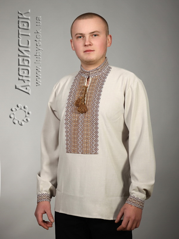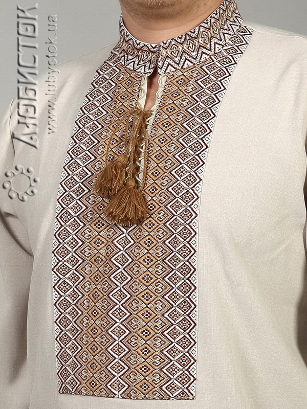 Вишиванка - вишита чоловіча сорочка на льоні ЧС 2-7L. Крій - традиційний. Комір - вишита стійка. Горловина на петлях зі шнурком та кутасиками. Краї рукавів з вишивкою на манжет і ґудзик. Вишивка ткана, коричневими та золотистими акриловими нитками. Візерунок 7 - геометричний. Тканина стреч-льон, можливе виготовлення із 100% льону.