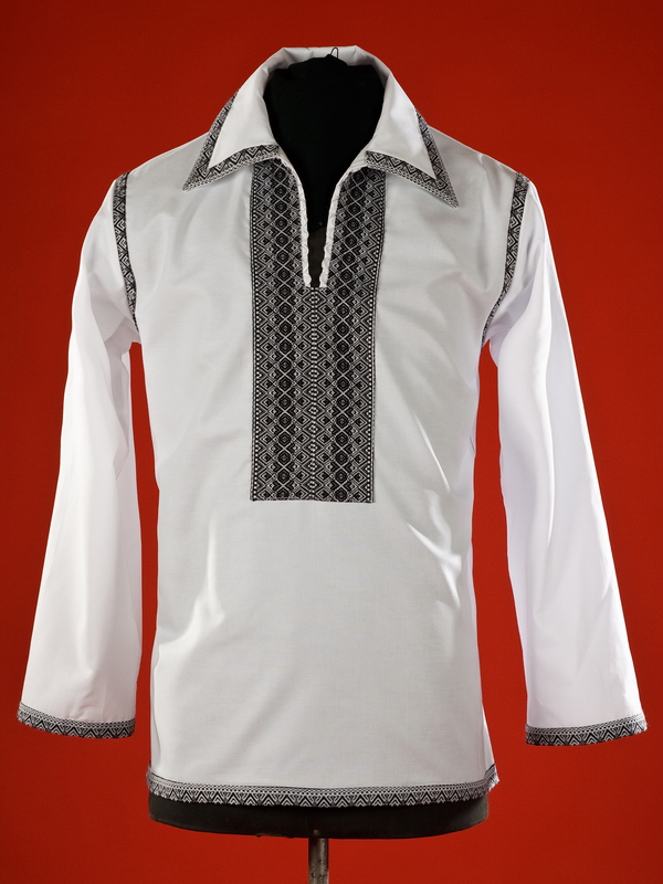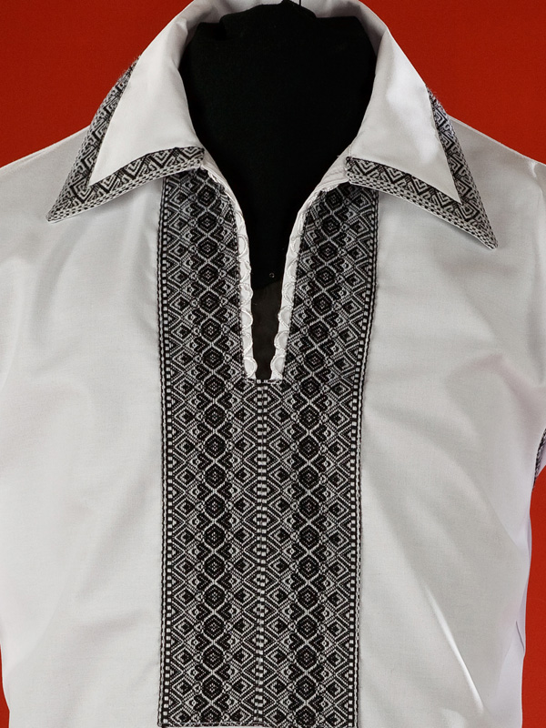Строга, святкова, чоловіча вишита сорочка - вишиванка ЧС 21-5. Буде пасувати до чорного класичного костюму на урочисті події. Крій - сучасний. Комір - відкладний, вишитий по краям. Горловина на петлях зі шнурком та кутасами. Краї рукавів - труби з вишивкою, без манжета. Особливістю цієї сорочки є вишивка на з`єднані рукава та сорочки і обшитий вишивкою низ сорочки. Вишивка ткана, чорними та білими акриловими нитками. Візерунок 5 - геометричний. Тканина якісна біла сорочкова, можливе виготовлення із 100% бавовни або 100% льону.