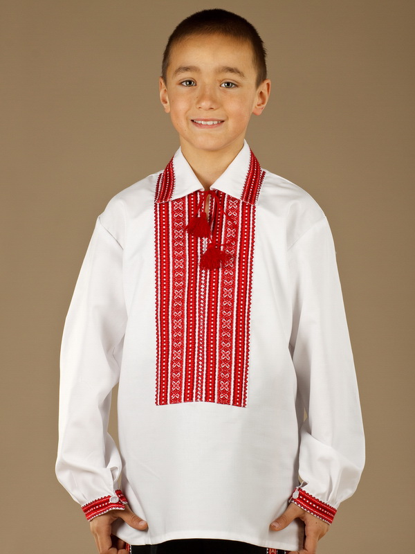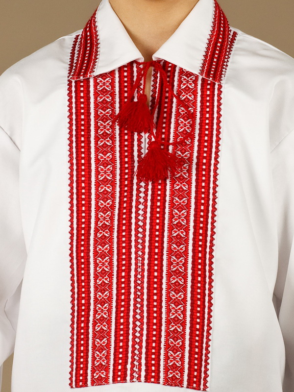 Вишиванка - вишита чоловіча сорочка ЧС 23-10. Крій - сучасний. Комір - відкладний, вишитий по краям. Горловина на петлях зі шнурком та кутасами. Краї рукавів з вишивкою на манжет і ґудзик. Вишивка ткана, червоними та білими акриловими нитками. Візерунок 10 - геометричний. Тканина якісна біла сорочкова, можливе виготовлення із 100% бавовни або 100% льону.