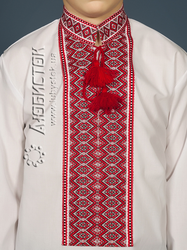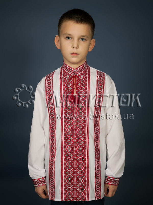 Вишиванка - вишита сорочка для хлопчика ЧС 28-75Д з тканою вишивкою. Крій - український, традиційний. Комір - вишита стійка. Горловина на кнопках з кутасиками. Краї рукавів з вишивкою на манжет і ґудзик. Вишивка ткана, червоними, чорними та білими акриловими нитками. Візерунок 75 - геометричний. Тканина якісна біла сорочкова.