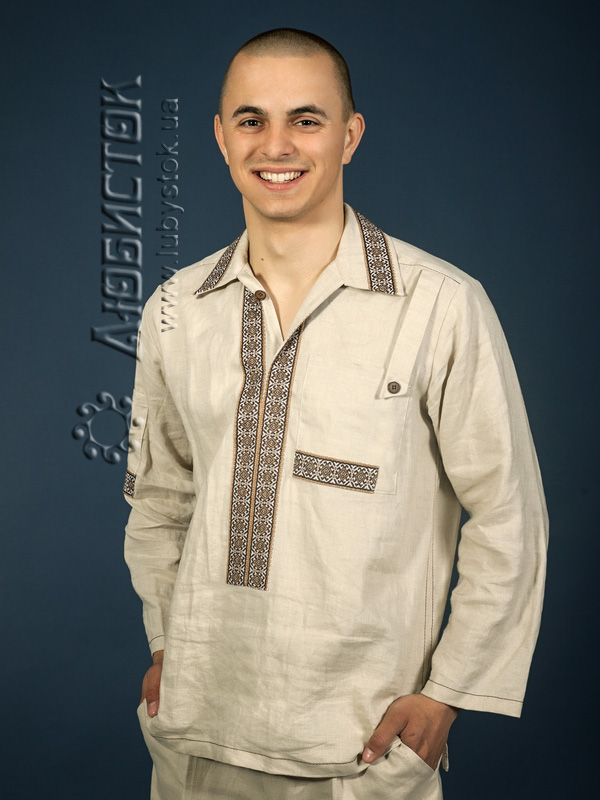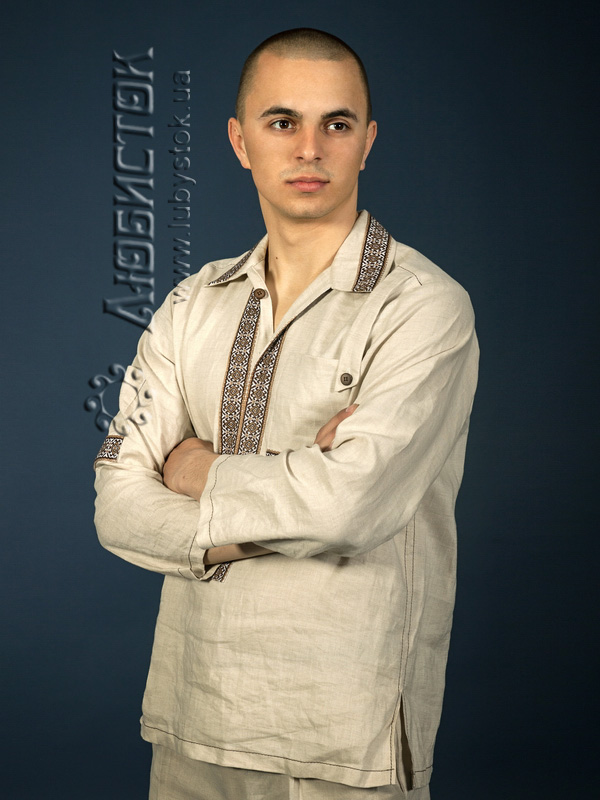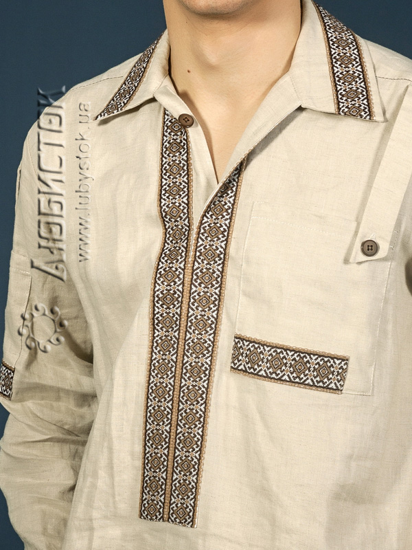 Вишиванка - вишита чоловіча сорочка на льоні 3-62L. Крій - сучасний. Комір - відкладний, вишитий по краям. Вишивка ткана, коричневими акриловими нитками. Візерунок 62 - геометричний. Тканина 100% льон.