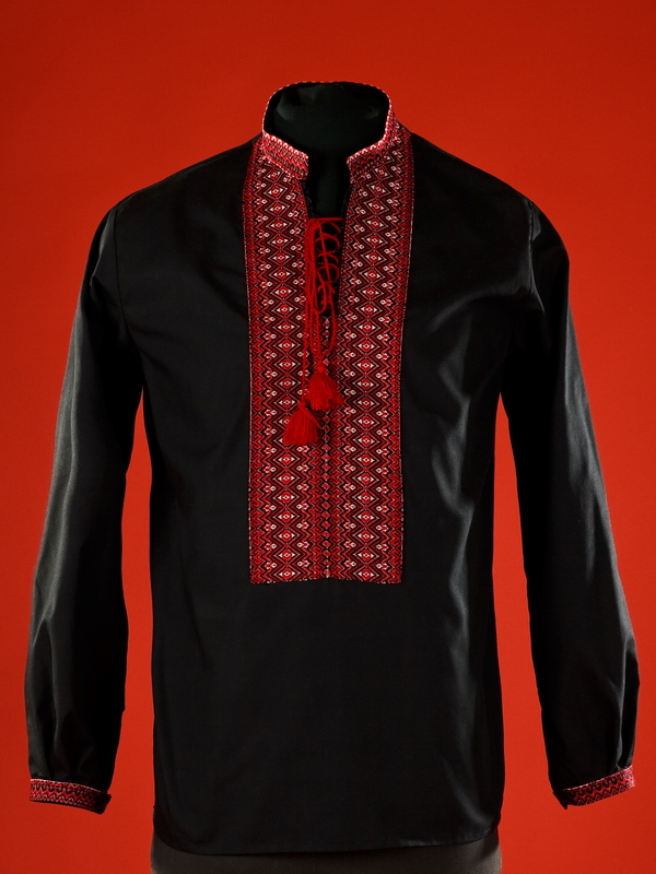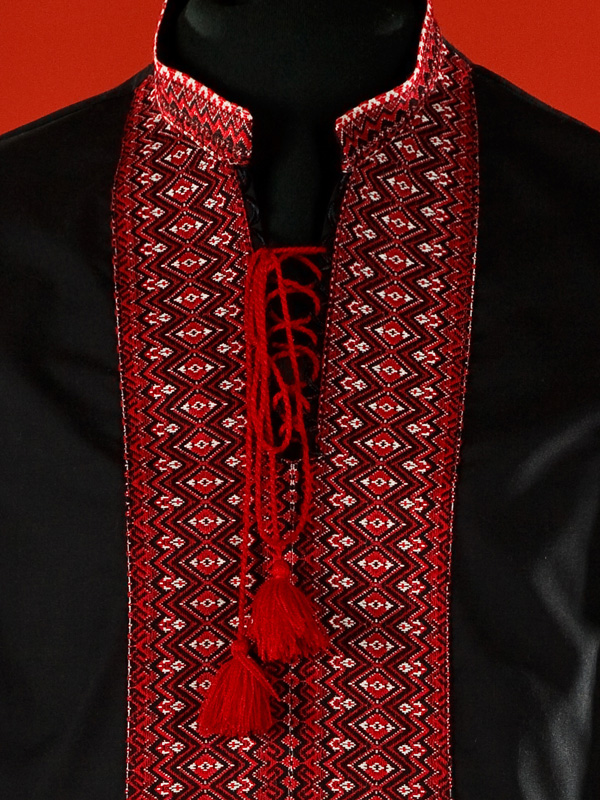 Вишиванка чорна - вишита чоловіча сорочка ЧС 7-1. Крій - український, традиційний. Комір - вишита стійка. Горловина на петлях зі шнурком та кутасами. Краї рукавів з вишивкою на манжет і ґудзик. Вишивка ткана, червоними, чорними та білими акриловими нитками. Візерунок 1 - геометричний. Тканина якісна чорна сорочкова, можливе виготовлення із 100% бавовни або 100% льону.