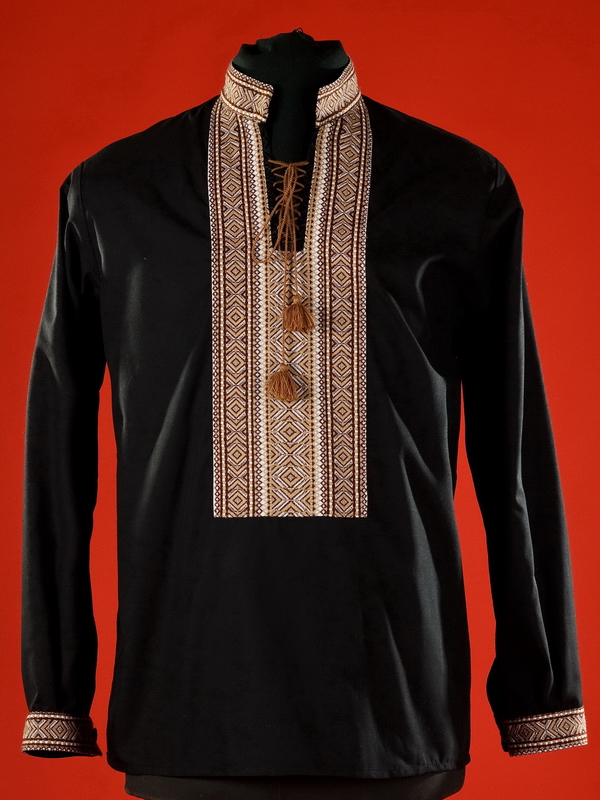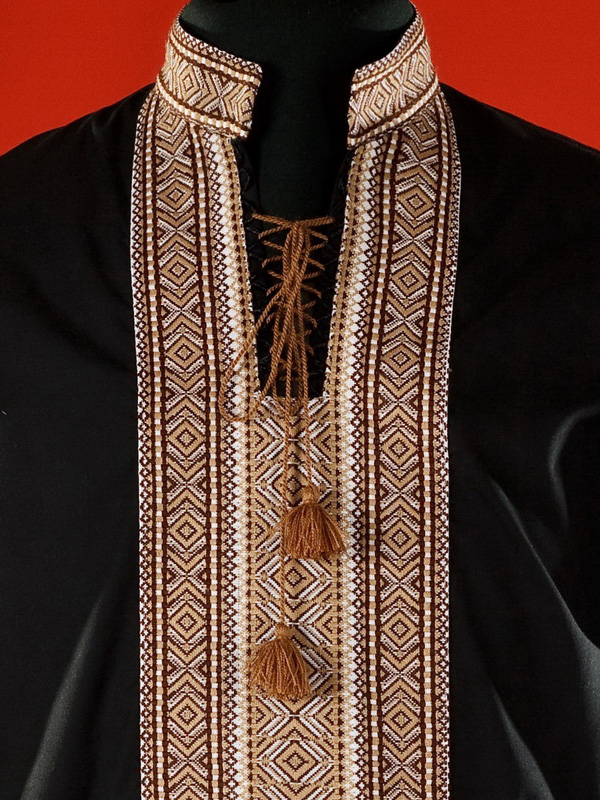 Вишиванка чорна - вишита чоловіча сорочка ЧС 7-14. Крій - український, традиційний. Комір - вишита стійка. Горловина на петлях зі шнурком та кутасами. Краї рукавів з вишивкою на манжет і ґудзик. Вишивка ткана, коричневими акриловими нитками. Візерунок 14 - геометричний. Тканина якісна чорна сорочкова, можливе виготовлення із 100% бавовни або 100% льону.